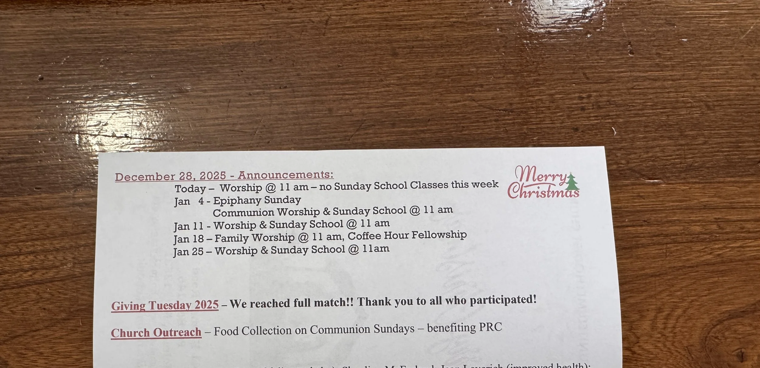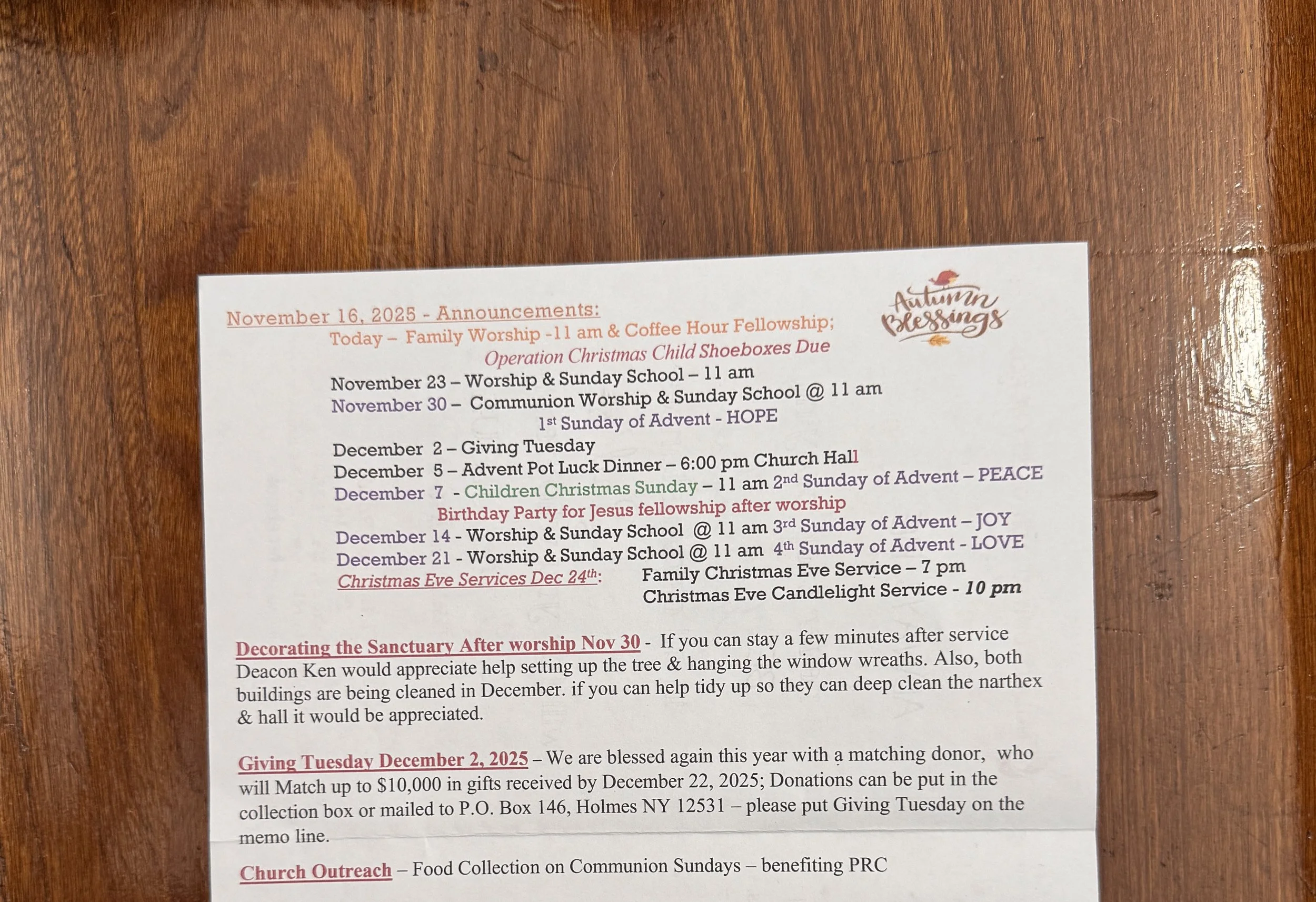 Giving Tuesday 2024 - We are blessed again this year with a matching donor, who will Match up to $10,000 in gifts received by December 23, 2024; Donations can be put in the collection box or mailed to P.O. Box 146, Holmes NY 12531 - please put Giving Tuesday on the memo line.